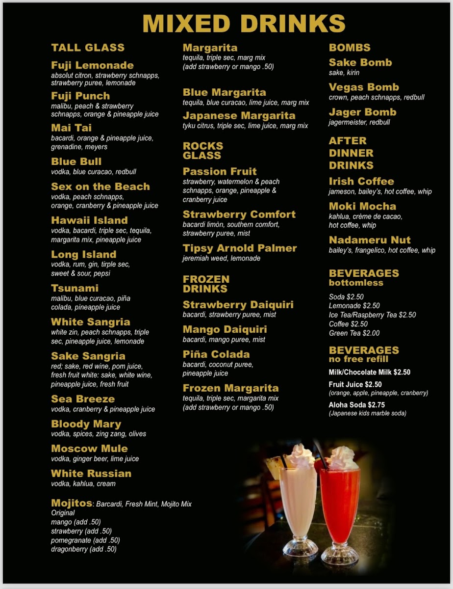 Additional menu highlights include Onion Soup, Miso Soup, Chicken and Steak Hibachi plates, Salmon Teriyaki, various Hibachi combinations with rice and vegetables, and a selection of drinks including Lemon Drop Martini, Frozen Margarita, and Frozen Strawberry Daiquiri.