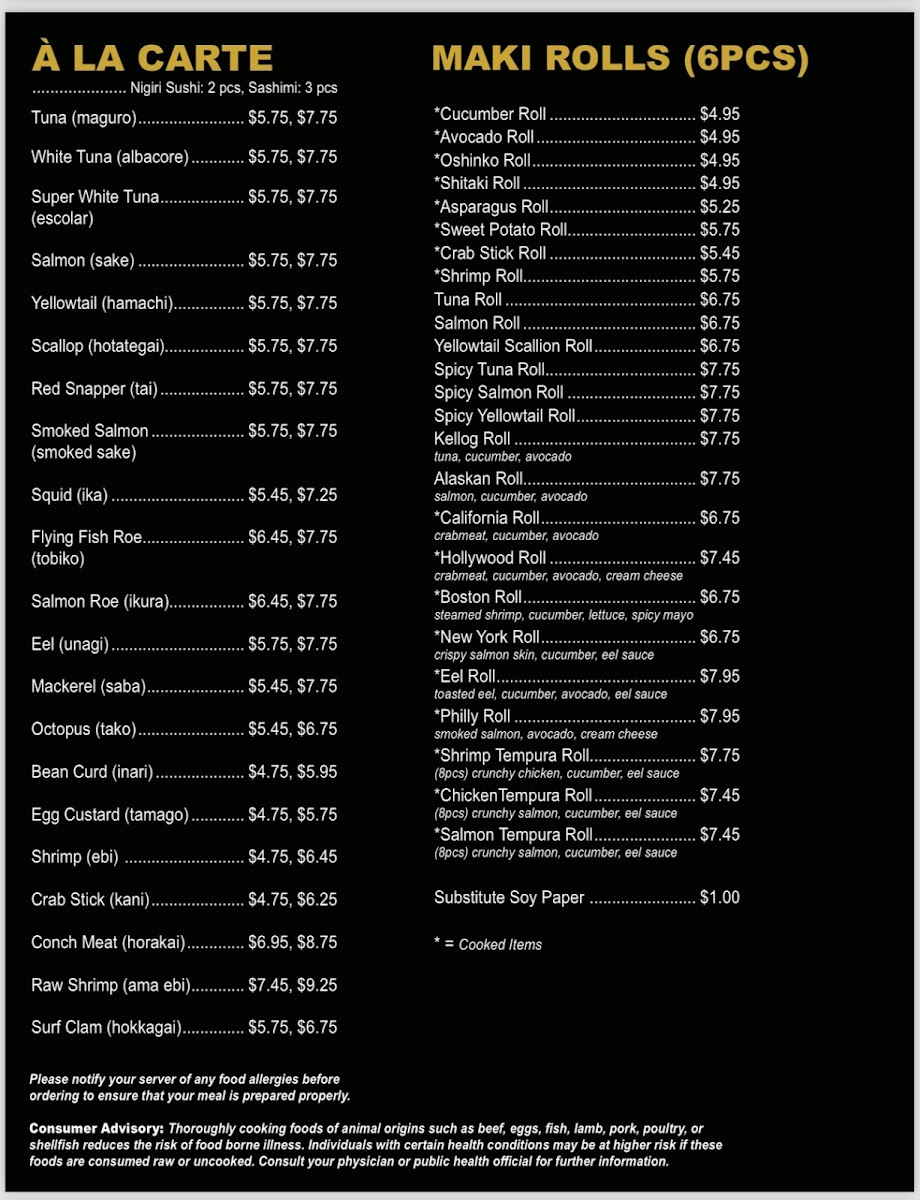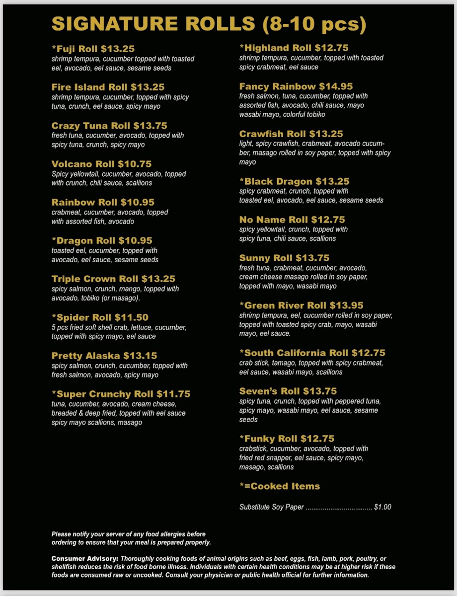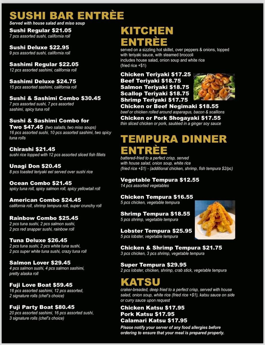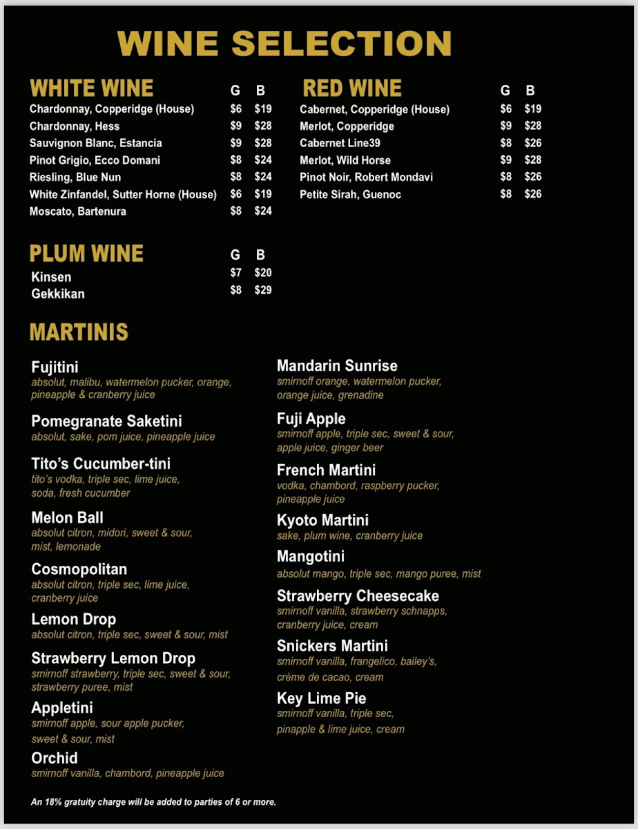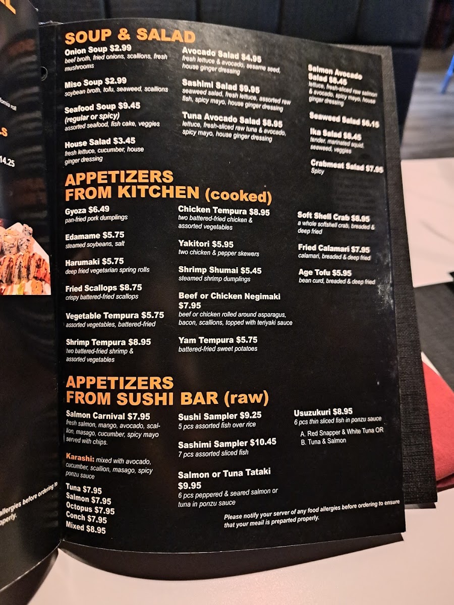 The menu is suitable for lunch and dinner dining occasions, offering options that range from light appetizers and sushi selections to hearty hibachi and steak entrées. Visitors can expect a combination of quick orders from the lunch kitchen and more elaborate cooked-to-order meals from the hibachi grill.