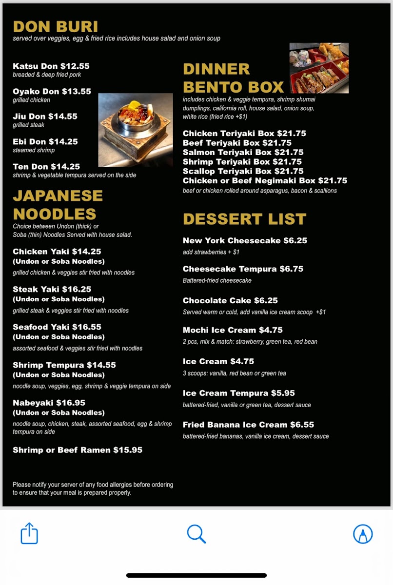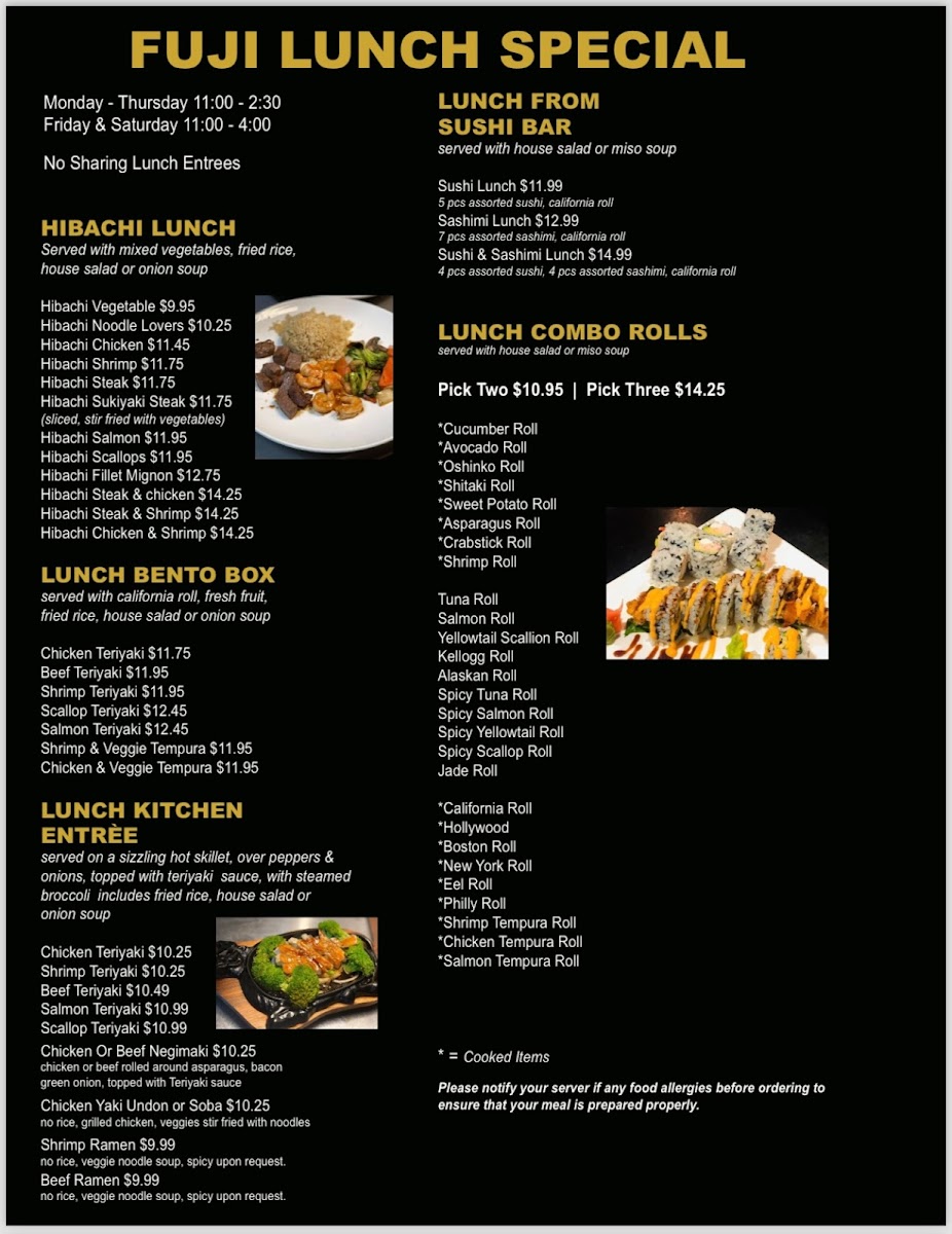 Lunch Kitchen Entrées: The lunch menu features classic Japanese dishes such as Chicken Teriyaki, Shrimp Teriyaki, Chicken or Beef Negimaki, and noodle dishes like Chicken Yaki Udon or Soba. Ramen varieties including Shrimp and Beef Ramen are also available.