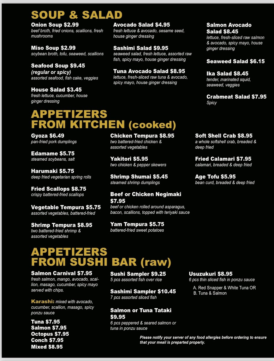 Sushi Bar Appetizers: The sushi bar offers selections including Salmon Carnival, Karashi Tuna, Octopus, as well as mixed sushi and sashimi samplers. Additional options include Salmon or Tuna Tataki and Usuzukuri.